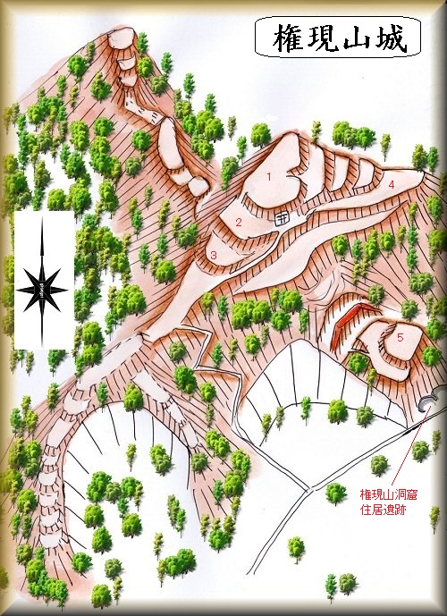 この城の東側の下には国指定史跡の権現山洞窟住居遺跡があり、地図などにも掲載されている。それを目印にするとよい。