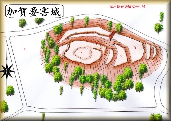 加賀要害山城は、加賀漁港に臨む比高20mほどの独立山稜に築かれている。今は周囲が埋め立てられているようだが、かつては海に浮かんだ島だったのではないだろうか。