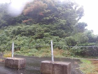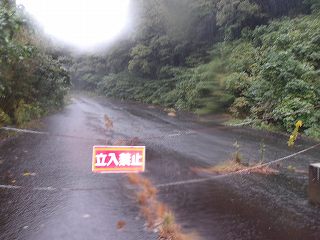 遠望、 | 林道入口。通行止めになっており、道路に水が流れている。 |