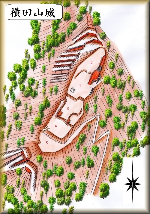 山頂部の1が主郭で、東側を除く三方向にテラス状の郭を配置している。さらに北東側には尾根なりに何段もの郭を造成している。