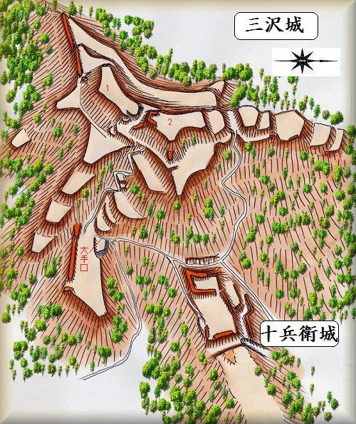 以下、山城攻城記より引用 概 要 出雲最大の国人とされた三沢氏の居城として知られている。全山が要塞化しており、普請は十分である。 四日市方面は比較的緩やかな地形だが、西方の阿井川方面は急唆な地形となっている。山頂はほぼ同じ高さの郭が堀切を隔てて築かれている。 1郭を地元では「本丸」、2郭を「鳥居ケ九」と称しているが、2郭南端の上檀を櫓台と見るならば2郭が主郭になる。 郭2の東方には水の手とされる池を隔てて「十兵衛成」が築かれており、北側には横堀が確認できる。 虎口は随所に確認することができ、「大手口」には石垣が築かれている。尾根を削って土塁とし、防御ラインを構成する技法等から改修時期が新しいとも考えられる。四日市には「納戸垣内」、「座頭屋敷」、「成田屋敷」等の地名が残る。 島根県教育委員会『島根県中近世城館跡分布調査報告書』より引用 県指定史跡 三沢城 三沢城跡は北に斐伊川、南はその支流阿井川にはさまれた標高418mの鴨倉山を中心に位置し、山陰、山陽を結ぶ要衡の地につくられている。 築城は14世紀初頭に三沢郷地頭の三沢氏によって築城されたと伝えられ、北側と東側の尾根を中心に大小30以上の曲輪が確認されている。 地元では1郭を「本丸」2郭を「鳥居ケ丸」と呼んでいるが、南端の土壇を櫓台とみて2郭を主郭(本丸)とする考えかたもある。 虎口が数カ所確認されるほか、大手門には石垣が残っている。 三沢氏は、築城後勢力を拡大し、16世紀はじめ頃には横田庄内の高鰐山に藤ケ瀬城を築き、さらに仁多郡ほか大原郡にも所領を持ち、 出雲国内最強の国人として、後に出雲を支配する尼子氏にとっても侮りがたい勢力を持ったと伝えられている。 この城跡は、土塁、堀切、桝形など中世山城の遺構をよくとどめており戦国時代の豪快な縄張りの山城として貴重である。 なお、城域内の現在地からの登り道は比較的緩で、本丸まで徒歩20分の道のりである。 麓の看板より |