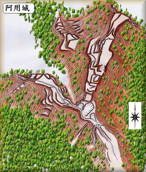以下、山城攻城記より引用 概 要 尾根上に3群からなり、郭は60余を数える。郭の削平は総じてあまいが主郭部は土塁で固め、虎口も充実している。自然の岩石を堀切に見立て、隣接する連花寺も城域としている。城将に桜井宗的が伝えられ、永正年中、尼子政久の大軍に攻められた。なお、政久はこの陣中で死したと軍記は伝える。 島根県教育委員会『島根県中近世城館跡分布調査報告書』より引用 阿用城由来記 阿用城跡は、十四世紀から十六世紀、南北朝時代から室町時代にかけて阿用を支配した土豪桜井氏の居城跡である。 桜井氏は京極氏の家臣であったが、十五世紀の終わりに京極氏に代わって出雲の覇者になった尼子氏に従わなかったため攻め滅ぼされたと伝えられている。 城域は、標高309mの通称磨石山の頂部から延びる尾根上や支尾根上に延600mにわたり大小60余りの郭(平らに加工された区画、曲輪)が配置された大きな山城である。しかし、郭面は自然地形のままのところも多く、土塁も明確なものは山頂の主郭の一部のみである。また斜面に竪堀(敵の移動を防ぐための竪状の堀)は見当たらず、城の縄張り(構造)としてはややまとまりを欠く。 城主の居館については、平成元年多量の埋納銭貨が発見された南西側上集落の山麓区域が考えられる。また下方の福富集落東側丘陵上には福富城跡があり、阿用城の支城跡の一つと考えられる。 阿用城の城攻めについては軍記物の『雲陽軍実記』及び『陰徳太平記』に独特の文学的表現で劇的に語られている。即ち寄せ手の大将尼子政久(経久の嫡男)が夜、向城の櫓上で笛を吹いていたところ、阿用城主桜井宗的に向いの竹やぶから矢を射掛けられるという奇襲作戦を受けて殺された。この事件の後阿用城は尼子軍の総攻撃を受け落城したと記されている。また『佐々木系図』(佐々木寅介蔵原本・県立図書館写本蔵)には政久 の死について次のように記している。「政久 又四郎 民部少輔、永正十年(1513)癸酉九月六日於雲州阿用城流矢卒歳廿六 法名華屋常心」 落城の時期については雲陽軍実記は1508(永正5年)、陰徳太平記は1518年(永正15年)とする。これらの三資料から阿用城落城1510年前後と考えられるが、あるいは佐々木系図の1513年が当たっているかもしれない。 平成二十二年十月 阿用地区復興協議会 山頂看板より 歴史 1513年 尼子政久が阿用城攻め逆に桜井宗的に射掛けられ戦死する 怒り狂った尼子経久は総攻撃をかけて落城する 1570年 尼子勝久が再興軍として出雲に反旗を翻した頃毛利勢は尼子方に総攻撃をかけ、小早川隆景は出雲国中郡に出陣し、二月七日多久和大和守の守る城を切崩したため阿用にあった要害も落城した |