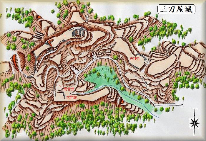 以下、山城攻城記より引用 概要 出雲国のほぼ中央に位置し、街道の要衝に築かれた城郭である。 三刀屋氏は三刀屋じゃ山城からこの地に居城を移したと伝えられているが、現在残る遺構は近世初頭の遺構である。 主郭は最高所と考えられるが、「破城」と近年の公園化にともなう車道の設置によつて破壊されている。 主郭北東端には天守台が築かれてい.た。主郭は石土居によつて二段に分けられている。 主郭西端には深い堀切が築かれており、尾根筋に対してA一B一C― Dの防御ラインが築かれている。 普請は、主郭、主郭南の「伝馬舎郭J、「大門郭」周辺は十分におこなわれているが、「伝天神丸」周辺は不十分である。 水の手は「殿井手水路」と呼ぶ水路が伝わる。最終改修者は堀尾氏と考えられる。 島根県教育委員会『島根県中近世城館跡分布調査報告書』より引用 三刀屋城跡 この城は承久3年(1221年)以来360年余りにわたってこの地を支配した三刀屋氏(諏訪部氏)の居城のひとつであり、東西に連なる尾根を堀切によって独立させたいわゆる平山城である。現存する遺構には、石垣や横矢構えなどの近世的手法もみられ、三刀屋氏最後の頃か堀尾氏の時代に元の支城を本城として整備し直したものと考えられる。 看板より |