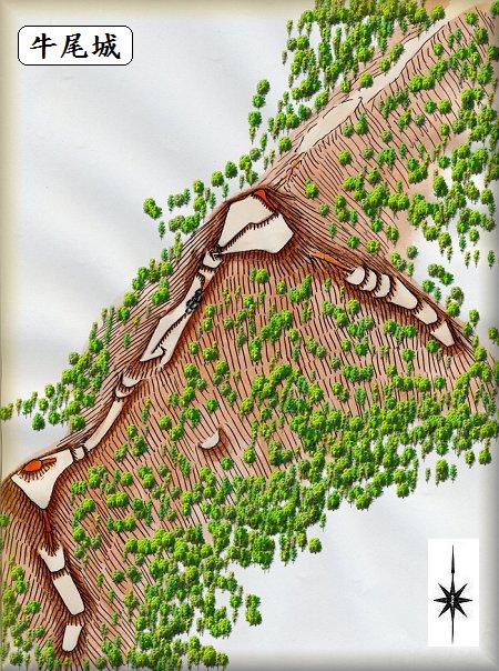 以下、山城攻城記より引用 概 要 急峻な地形を利用して築かれており、堀切は確認できない。最高所が主郭と考えられ、尾根筋に対して土塁を築いている。 普請は全体的に不十分だが、地形が急峻なため必要とされなかったものか。尾根伝いに入雲山を経て熊野城に連絡できる。 毛利軍は入雲山に高津場番城を築いて両城の連絡を進断し、個別撃破したと伝えられている。牛尾氏の居城として知られる。 島根県教育委員会『島根県中近世城館跡分布調査報告書』より引用 「尼子分限帳」には、御家老衆牛尾遠江守 備前之内十万石、お手廻り衆牛尾太郎左衛門 伯耆之内一万七千石、同牛尾弾正大弼 松江の内三千七百三十二石と見え、大身であったことが知られる |