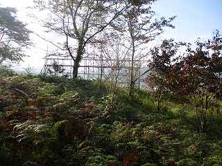 郭の西側も高さ15mほどの切岸となっており、降って行ったところが3郭である。3郭には鉄骨が組まれていた。何かのイベントの際は、ここに城の絵を掲げたりするのであろうか。