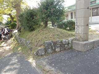 地域支援センターと小学校との間辺りには土塁と段差のようなものが見られ、そこに小さな石碑が建てられている。