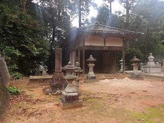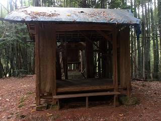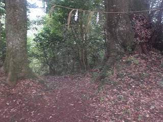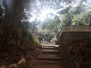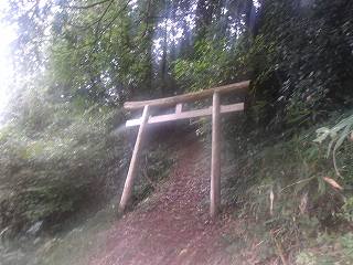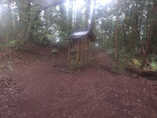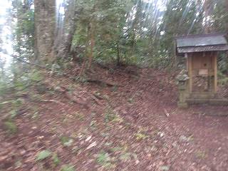 これが神社の参道入口である。そこから登って行けば、数段の腰曲輪の脇を経由して神社の建てられている2郭まで簡単に登って行くことができる。