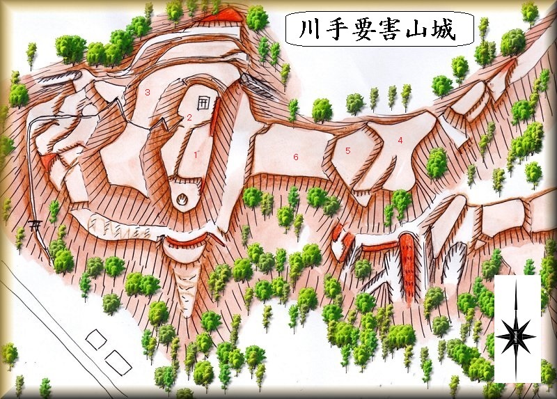 山稜そのものは東側に向かって続いており、東側の下には大堀切があって、その先に4,5といった郭が造成されている。