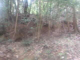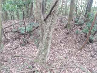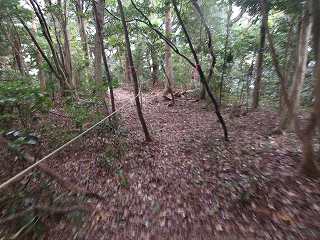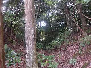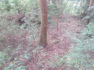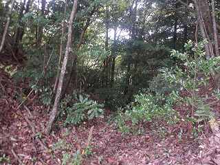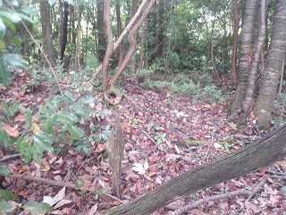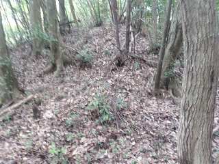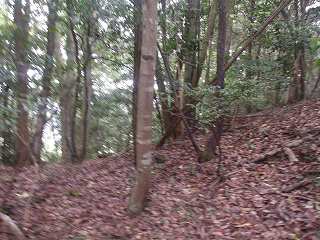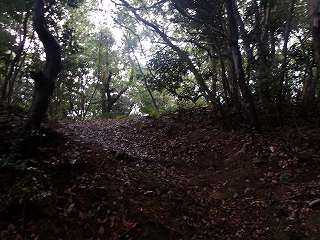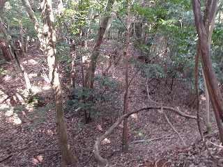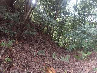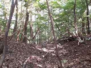 比高30mほどであるから、登って行ったところ、すぐに山稜上まで到達することができた。その辺りから山麓にかけて長い竪堀が掘られていた。これが城の西端を示すものなのである。