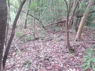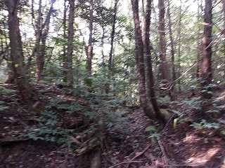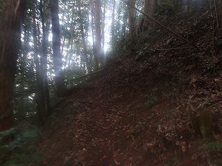 神社から登城道は付けられていなかったので、どこかからか直登していくしかない。神社の左側の山稜はヤブが少なかったので、そこから登って行くのが簡単であろう。