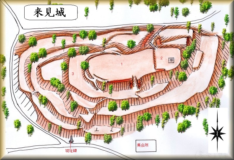来見城は、主郭部を中心として地形なりに腰曲輪を数段造成して巡らせた構造をしている。
