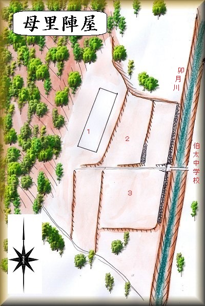 母里陣屋は、安来市立伯太中学校の西側にある微高地に築かれていた。