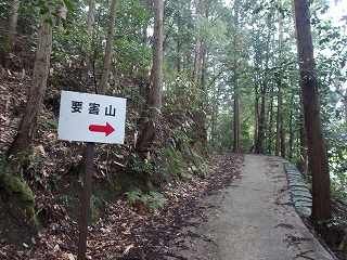 神社の下から道路が付けられており、そこに「要害山→」という案内板が立てられている。
