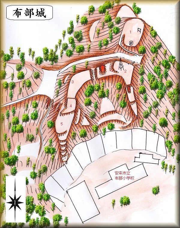 布部城は、広瀬町布部にある布部小学校の背後にある比高60mほどの要害山に築かれている。
