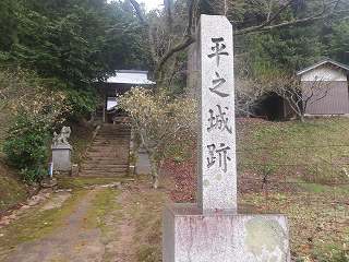 そこから参道を進んで行くと、本殿下の石段の脇に「平之城跡」という立派な城址碑が建てられていた。地元では城址としてしっかり認識されているようである。