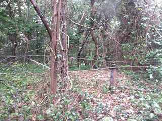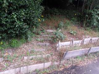 畑の奥はヤブになっているが、それを進んで行ったところ、高さ3mほどの切岸の壁に行き当たった。鋭く削られており、とても登れそうではないが、ありがたいことに、そこに鉄の梯子が置かれていて、上に登ることができるようになっていた。