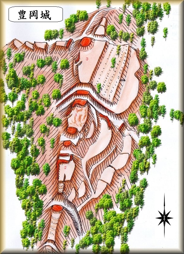 豊岡城は、山稜にあった古墳を利用しながら、堀切や土塁によって構築された、3つの郭をメインとした城郭である。