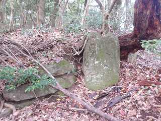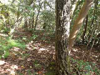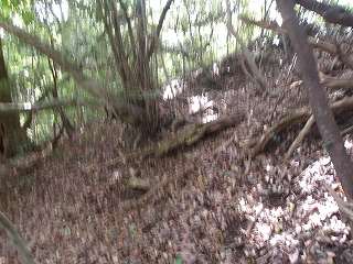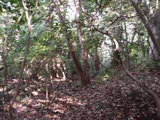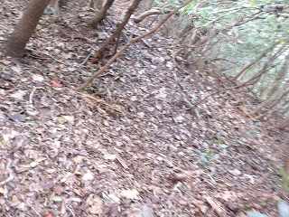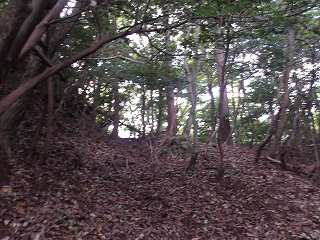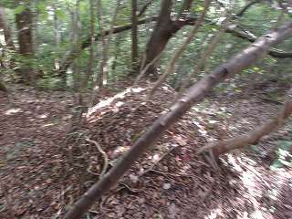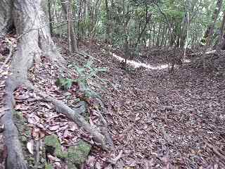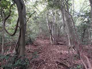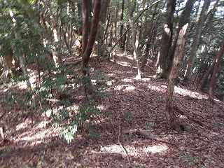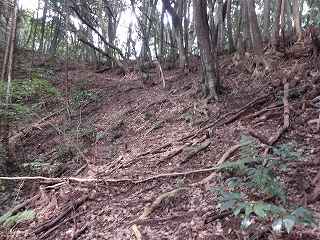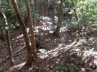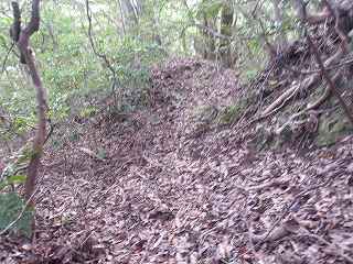 尾根に取り付いて少し行くと堀切跡のような段差が見られたが、遺構なのかどうか分からない。