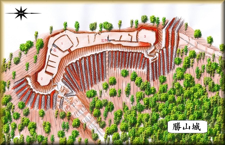 勝山城は尼子十砦の1つであり、もともとは尼子氏の支城であったと考えられている。城将は田中三良左衛門であったと伝えられている。 天文12年(1543)に尼子氏の月山富田城を攻めるために、大内義隆が来襲してきて京羅木山に軍勢を勧めた際には、ここを陣所としたという。 また永禄年間、毛利氏が月山富田城を攻撃した際にも、毛利元就はここに陣を置いた。 正面に富田城が見えるので、本陣を置くのにちょうどよい場所だったのであろう。 |