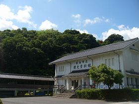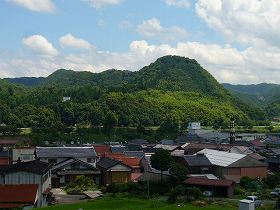 道の駅「広瀬富田城」から富田川越しに見る京羅木山。天文11年(1542)の大内軍による富田城攻めの際に、大内軍の本陣が置かれた山であるという。ここからの比高は360mほどもある。今回は登山できなかったが、北方の出雲金比羅宮辺りから登山道がついているということである。 | 道の駅「広瀬富田城」のすぐ脇にある歴史資料館。背後の比高15mほどの台地が千畳平である。 |