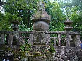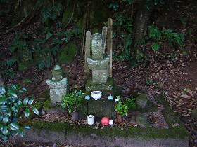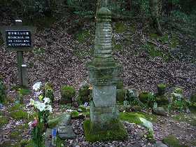 巌倉寺の奥にある堀尾吉晴の墓。大名の墓だけあって、なかなか立派なものである。このすぐ脇には吉晴の奥方が慶長年間に建立したという山中鹿介の供養塔もある。 | 月山のずっと奥の方の山麓にある尼子晴久の墓。晴久は剛勇な人物であったといわれているが、毛利氏による月山攻めの籠城の直前に急死したという。内通者に暗殺でもされたのであろうか。 |
