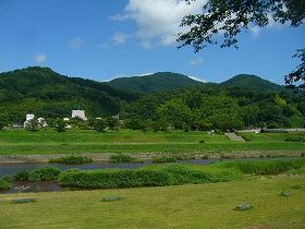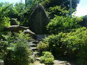 山中鹿介生誕を記念する石碑が置かれている。狭い谷戸部を利用して屋敷が置かれていたのであろう。 | 富田川の脇にある川中島決戦の碑。山中鹿介と毛利方の品川狼ノ介(大膳)とが戦った場所であるという。 |