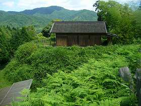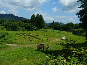 太鼓檀から一段上がった所が、奥書院平である。ここには忠霊塔が建っている。正面奥に本丸のある月山が見えている。 | 鞍部を過ぎてさらに進んだ所が花の壇である。ここには2棟の掘立建造物が復元されている。 |