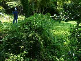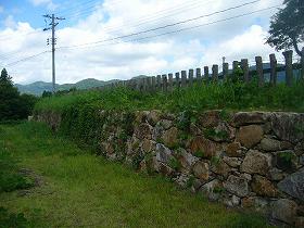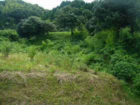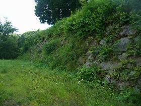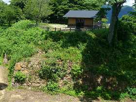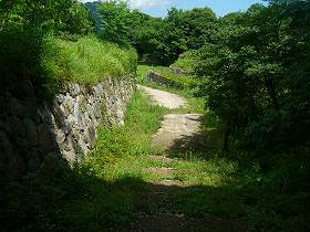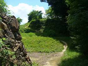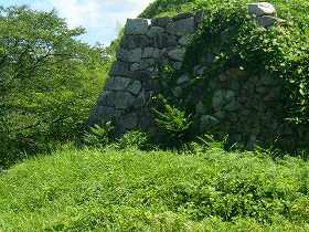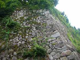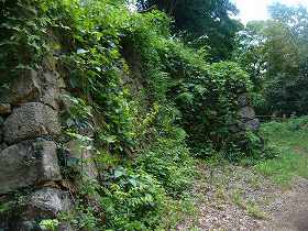堀切越しに南側にある郭から、北側の花の壇を見たところ。堀切の深さは5mほどである。 | 山中御殿平下の石垣。けっこうしっかりしたもので、堀尾氏時代のものではないかと思われる。 |