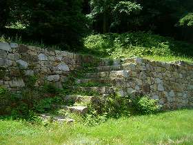 御殿平の大東平方面の虎口の石垣。手前には井戸の跡もある。ここが大手であろうか。 | 御殿平奥の石垣と雁木。 |