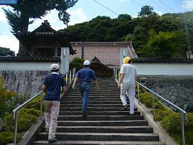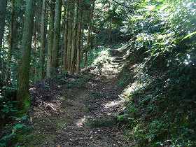 上の写真の雁木を上がった所から、山中御殿平の全容を見たところ。ここが実質的な城主の居住空間であったと思われる。 | 御殿平から登城道を上がっていく。通称七曲と呼ばれているが、実際には7つよりもずっと多いカーブを登っていかなければならない。御殿平からの比高はちょうど100mほどである。参道は丁寧に敷石が敷き詰められている。しかし雨上がりであったせいか、つるつるしていて、かえって歩きにくいったら。ありゃしない。 |
