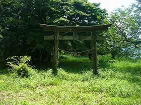 本丸側から二之丸を見たところ。郭の縁まで石垣を積めないのは、高石垣を築くだけの記述がなかったせいか、それとも石材がさほど豊富でなかったからであろうか。 | 本丸にある勝日高守神社。平安時代末期の保元の乱の頃からある神社だという。本丸は削平がわりあい甘く、ちゃんとした平場になっていない部分もある。この郭の脇に山中鹿介の碑もある。 |
