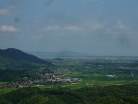 三之丸から中海方向を見たところ。山頂部が高いだけあって、なかなか眺望がよいのである。天気がいいので、境港辺りまで見晴るかすことができた。 | 二之丸と本丸との間の堀切。深さ7mほどだが、幅は20m近くもある。なぜか二之丸側にだけ、石垣が積まれている。この二ノ丸には、西側下に石垣による小規模な枡形虎口が形成されていた。 |