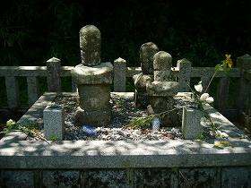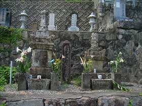 富田川を挟んで北側にある洞光寺の石段。石垣造りの本格的な寺院で、寺院そのものが武装していたかのような印象がある。 | 洞光寺には尼子氏全盛期をつくった尼子経久の墓がある。写真左手がそれである。右側は経久の父の清定の墓。 |