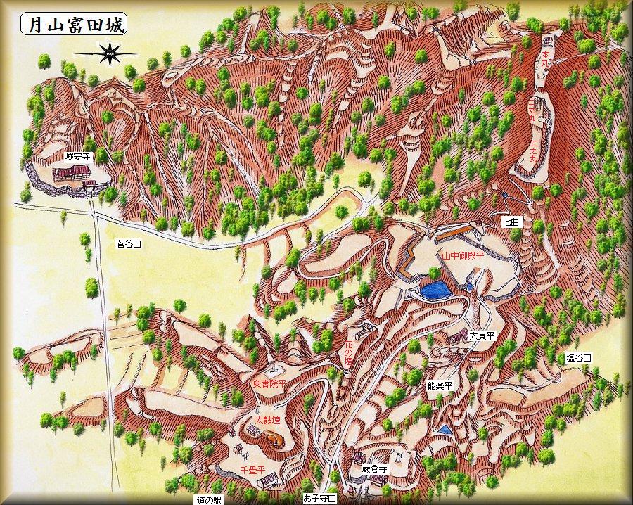 ちなみに、この城には「御殿平」「奥書院平」「千畳平」といった地名があるが、これらの「平」は「たいら」ではなく「なる」と呼ぶ。これは「平」のことを「なる」と呼ぶこの地方の方言によるもので、他に有名なものでは、鳥取城の近くにある「太閤平(たいこうがなる)」などもある。