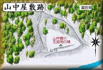 新宮谷の1つ南側の谷(月山から延びる尾根によって形成されている)には山中氏の屋敷跡がある。伝承によると山中鹿介はここで誕生したのだという。 |