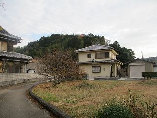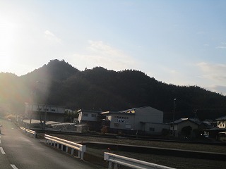 | 南側から遠望する上大野城。山頂部がとがって目立つ山である。ここからの比高は100mほどある。 | 途中の尾根上にある鳥居。ここで車を回転させることができる。ここから先は普通の舗装路だが、ここまで車で来るのは大変でお勧めしない。 |