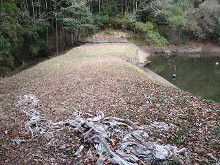 | 北側から遠望する畑山城。ここからの比高は20mほどある。 | 城の東側下にある池。この堤防上に車を置くことができる。 |