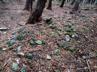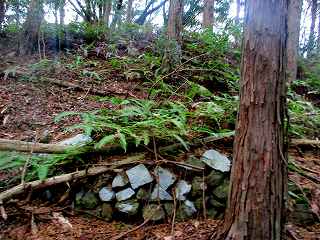 また、1郭への城塁を登って行くと、途中に小規模な石積みが何カ所かに見られる。ほんのわずかではあるが、石積みを構築しようとした意図も見て取れる。