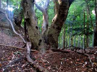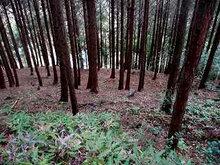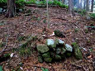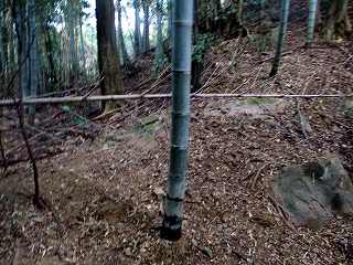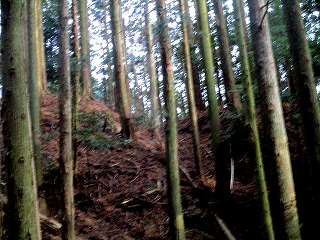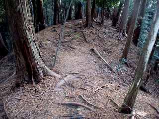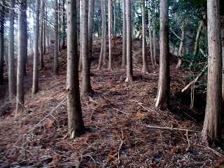 さて、この舗装された参道のために、城の遺構はけっこう破壊されてしまっているようである。『三好一族と阿波の城館』に掲載されている本田昇氏の図面によると、城は3段に削平された郭から成っているが、本来の登城ルートは舗装林道によって破壊されてしまっている。それでも3段の構造は理解することができた。