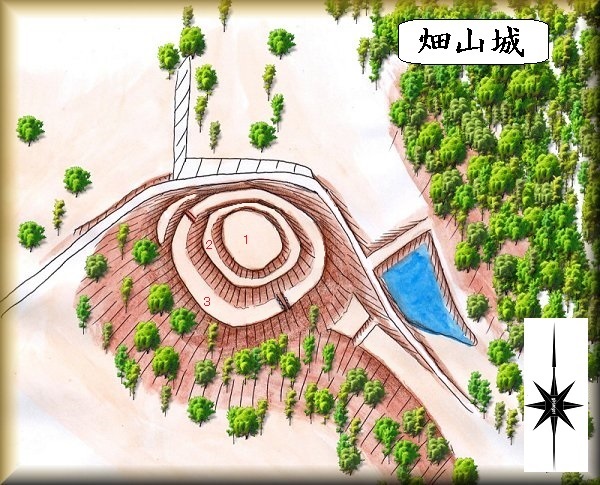 比高20mほどであるから、直登すればすぐに1郭に到達することができる。畑山城は、鳥坂城などと同様、同心円状に郭を配置した城郭で、3段構造になっている。