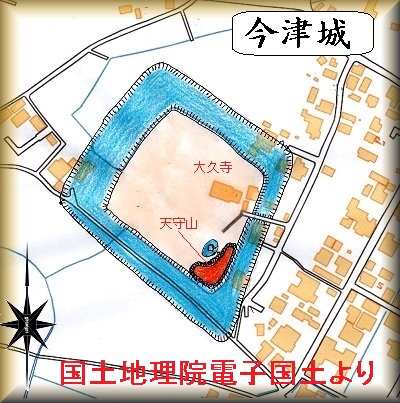 今津城は50m四方ほどの方形城館で、周囲には幅10mほどの堀が巡らされていた。