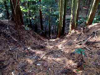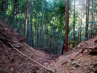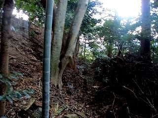 | 6郭下の堀切と6郭城塁が見えてきた。城内で最大の堀切である。 | この堀切の側面部。 |