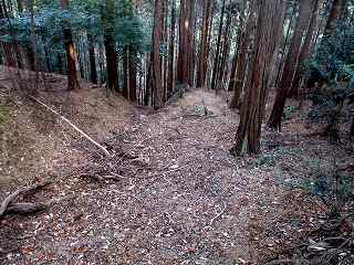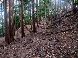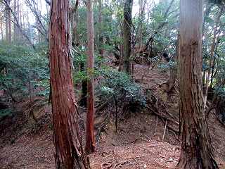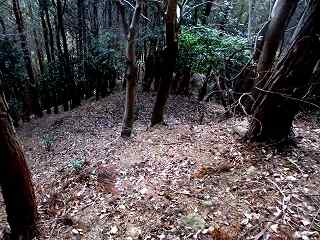 | 南側尾根にある堀切。 | 南側から段々の城塁を見る。 |