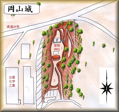 阿南市新野町樫房にある室姫神社の祭られている比高20mほどの山稜が岡山城の跡である。