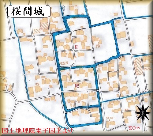 高川原の八幡神社の北側一帯が、桜間城の跡である。現状では遺構は消滅してしまっているが、城址周辺を巡っている水路が、かつての城の範囲を示しているようである。