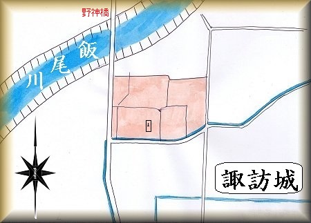 飯尾川に架かる野神橋の南東側一帯が諏訪城の跡であったと考えられている。