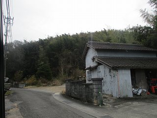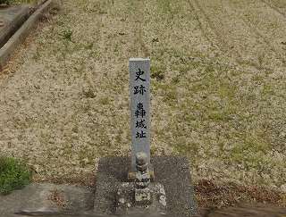 東側の山との間の谷間を進んで行く。すると途中の道路脇に「鳥坂城跡」と刻まれた石碑が建てられており、そこから石段が付けられているのが見えている。これが登城口である。
