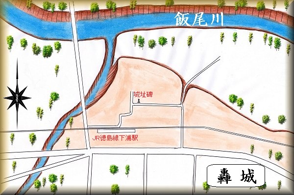JR徳島線下浦駅の北側一帯が轟城の跡である。飯尾川に臨む河岸段丘上の地形となっている。また西側も、飯尾川の支流沿いの土手状の地形となっている。