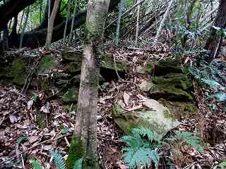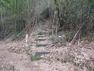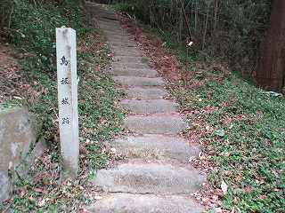 | 気延山遊歩道との間の分岐点。階段をまっすぐ登って行く。 | 途中の郭の縁部にある石積み。 |