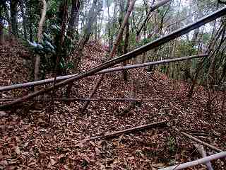 1郭の南側を降って行くと、そちらが尾根続きとなっており、ここに城域の南端を示す堀切が掘られていた。ちなみに、この堀切の脇から遊歩道を北側に向かって行くと、上記の気延山との分岐点の所に戻って行くことができる。
